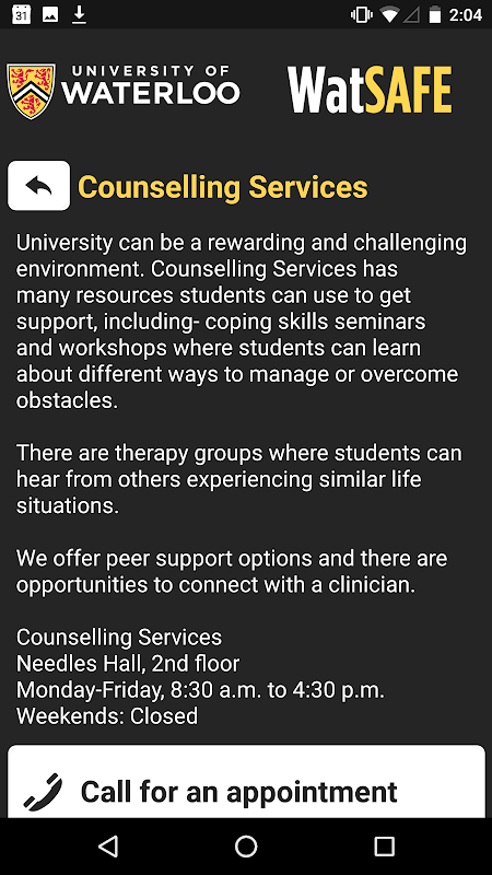 - आपातकालीन संपर्क: एक आपातकालीन या एक गैर आपातकालीन चिंता के मामले में संपर्क करें UWaterloo क्षेत्र के लिए सही सेवाओं