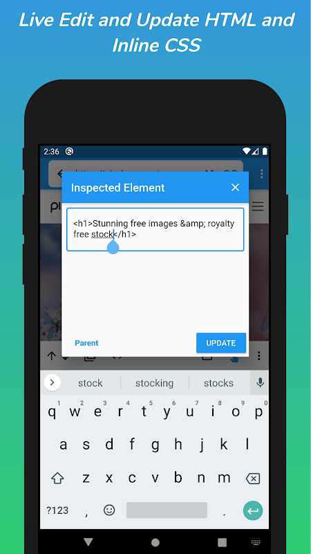 - यह एप्लिकेशन आपको वेबपेज पर एक तत्व को छूकर लाइव एचटीएमएल संपादित करने की अनुमति देता है