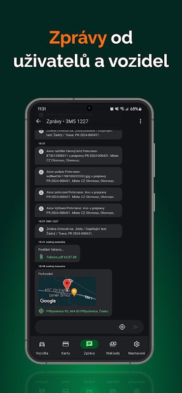 एप्लिकेशन वाहन की स्थिति और स्थान के बारे में अद्यतन जानकारी प्रदान करता है और इसे मानचित्र पर प्रदर्शित करने की संभावना भी प्रदान करता है। वाहन की गति और जीपीएस निर्देशांक के आधार पर, यह स्वचालित रूप से एक इलेक्ट्रॉनिक लॉगबुक रिकॉर्ड करता है, जिसमें व्यवसाय और निजी यात्राओं में विभाजन भी शामिल है। इसके अलावा, एप्लिकेशन लागत रिकॉर्डिंग प्रदान करता है - ईंधन भरने, धुलाई या सर्विसिंग के लिए रसीदें बहुत आसानी से एप्लिकेशन में दर्ज की जा सकती हैं और फिर डिजिटल रूप से आपके अकाउंटिंग सॉफ़्टवेयर में स्थानांतरित की जा सकती हैं। अंत में, एप्लिकेशन आपको अपने बेड़े प्रबंधक, डिस्पैचर या वाहन के अन्य उपयोगकर्ताओं के लिए एक संदेश छोड़ने की अनुमति देता है।
