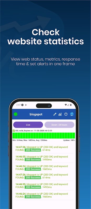 वेबसाइट के चालू रहने के समय की निगरानी करें और अपने फोन पर 24/7 वास्तविक समय अलर्ट प्राप्त करें।