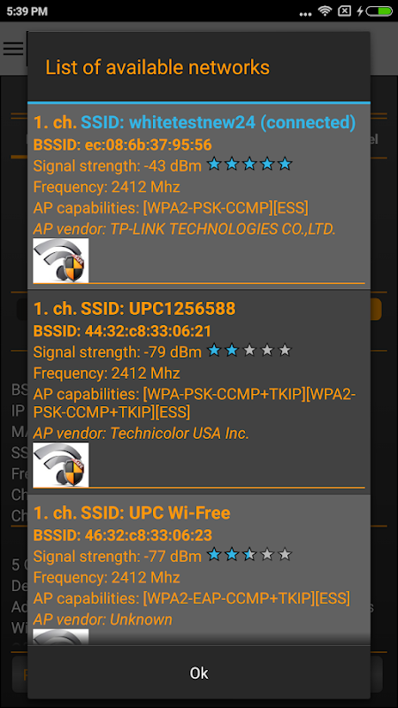 * एक्सेस पॉइंट, आवृत्ति, चैनल चौड़ाई, सुरक्षा स्तर और डीएचसीपी जानकारी, बीएसएसआईडी (राउटर मैक पता) के विक्रेता सहित आपके नेटवर्क और आपके एक्सेस पॉइंट के बारे में विस्तृत जानकारी।