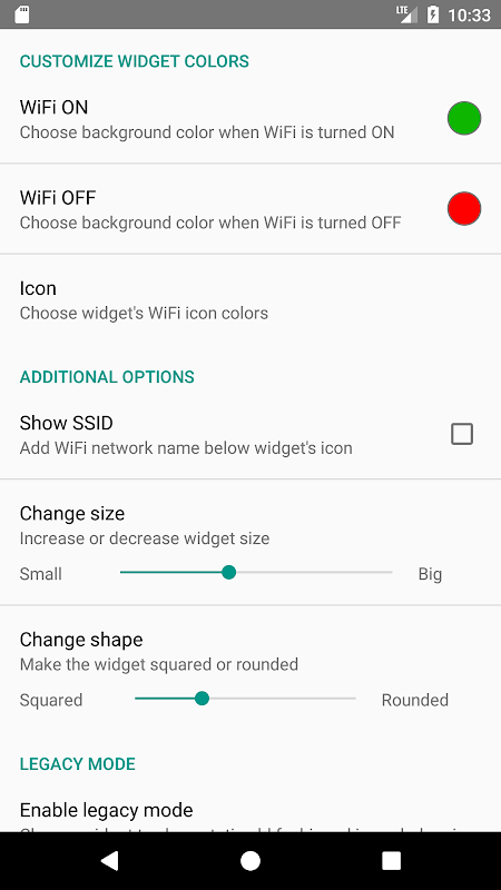 This app provides you with an essential WiFi toggle widget you can use to manage your WiFi Connection state directly on your phone desktop. Choose the color, shape, transparency and size you like the most and associate them with WiFi ON and OFF states!!