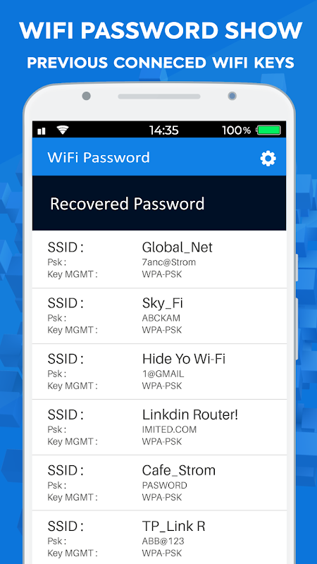 वाईफाई पासवर्ड मास्टर कुंजी शो एक स्मार्ट टूल है जो आपको वाईफाई कनेक्शन के सभी पासवर्ड देता है जो आपने कभी अपने डिवाइस से कनेक्ट किया है। आप सहेजे गए वाईफाई कनेक्शन के पासवर्ड देखना चाह सकते हैं जब कोई नया उपकरण हो जिसे कनेक्शन में जोड़ने की आवश्यकता हो। वाईफाई पासवर्ड मास्टर कुंजी शो एक क्लिक पर सभी वाईफाई पासवर्ड प्रदर्शित करने के लिए उपयोग किए जाने वाले वाईफाई पासवर्ड को पुनर्स्थापित करने के उद्देश्य से एक उपयोगी एप्लिकेशन है। आप खोया हुआ पासवर्ड पा सकते हैं, अपनी पासवर्ड कुंजी फिर कभी न खोएं।