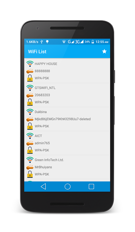 इस ऐप को रूट पहुंच की आवश्यकता है। यह वाईफाई कनेक्शन नाम, पासवर्ड और सुरक्षा प्रबंधन कुंजी दिखाता है अगर पहले किसी भी वाईफाई कनेक्शन से कनेक्ट होता है।