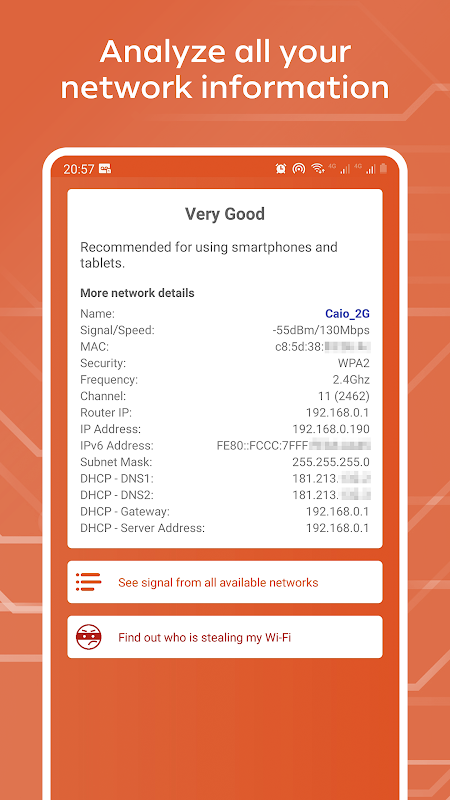 - पूरी तकनीकी जानकारी जैसे आईपी, राउटर आईपी, डीएनएस, मैक, चैनल, फ्रीक्वेंसी, स्पीड और बहुत कुछ।