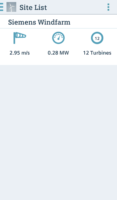 सीमेंस गमेसा पवन निदान एप्लिकेशन को आप वर्तमान उत्पादन और अपने सीमेंस पवन टरबाइन बेड़े पर स्थिति की निगरानी करने की अनुमति देता है; साइट और एकल टरबाइन स्तर पर। यह भी जब आप इस कदम पर हैं - एक विस्तृत साइट मानचित्र ताकि आप अपनी साइटों के चालू स्थिति पालन कर सकते हैं आप एक टर्बाइन की वर्तमान स्थिति देता है। आप उत्पादन, हवा की गति और घटनाओं के बारे में जानकारी प्राप्त करने के लिए एक एकल टरबाइन चुन सकते हैं। किसी विशेष साइट या टरबाइन का चुनाव करने में एप्लिकेशन के किसी भी कार्य करने के लिए नेविगेट करने के लिए कड़ी चोट नेविगेशन का उपयोग करें।