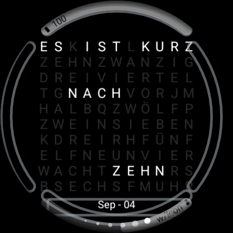 यह वेयर ओएस स्मार्टवॉच के लिए "वर्ड क्लॉक विजेट" का जर्मन संस्करण है।