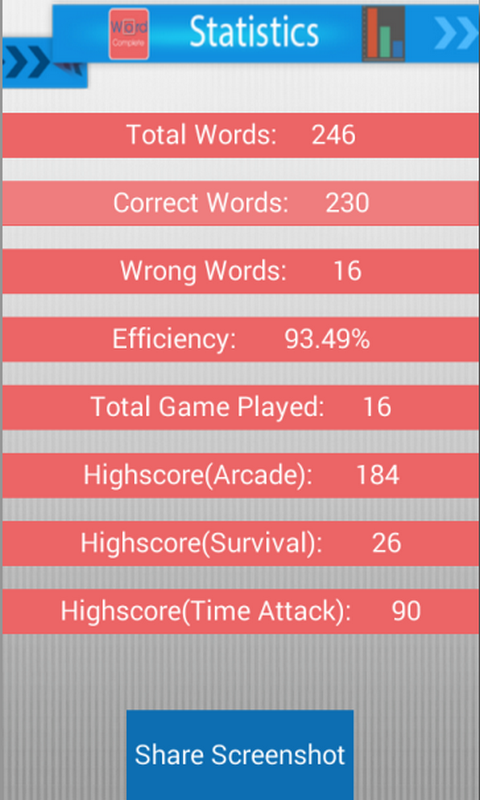 *** Arcade Mode - It is a standard classic mode where you will be given ten words to complete. For each word you have maximum 10 seconds. Try to complete the word as fast as possible to get better score (The left time adds to your score).