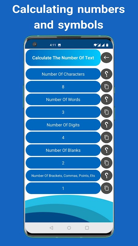 एप्लिकेशन कई लाभ प्रदान करता है, जिसमें ग्रंथों में संख्याओं की गणना, साथ ही अक्षरों की गणना, साथ ही रिक्त स्थान और प्रतीकों की संख्या शामिल है।
