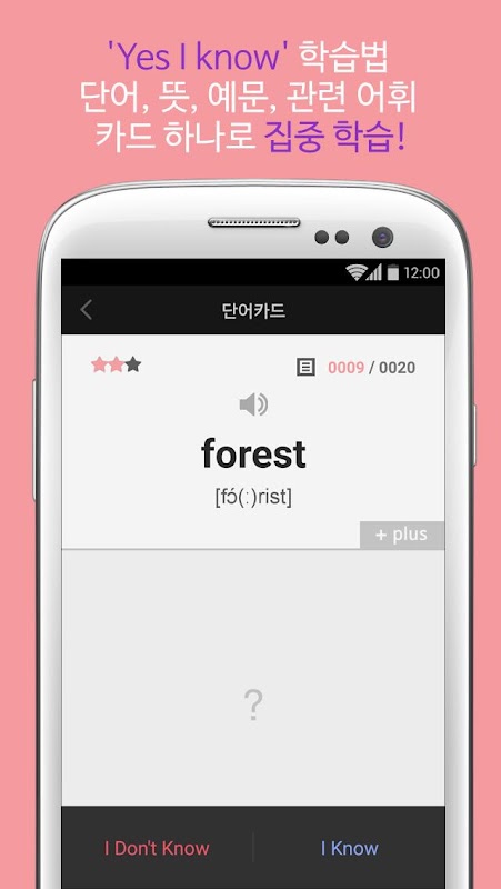 1. 단어카드 : 워드마스터 고유의 ‘Yes I Know’ 학습법으로 단어, 뜻, 예문을 하나의 카드에서 확인할 수 있으며, 한 번의 터치로 다음 단어로 이동이 쉽습니다.