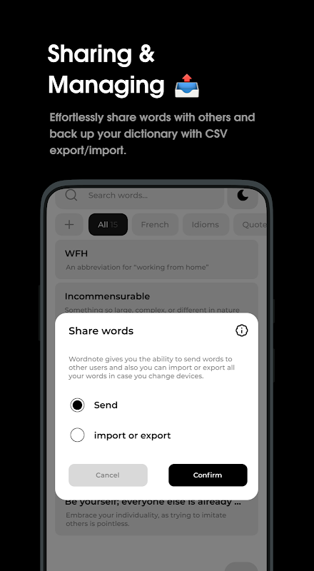 वर्ड नोट शब्द बचाने वाला ऐप है जो आपके द्वारा जोड़े गए शब्दों और वाक्यांशों को याद रखने में आपकी मदद करता है। अपना व्यक्तिगत शब्दकोश बनाएं, और अपनी शब्दावली याद रखें।