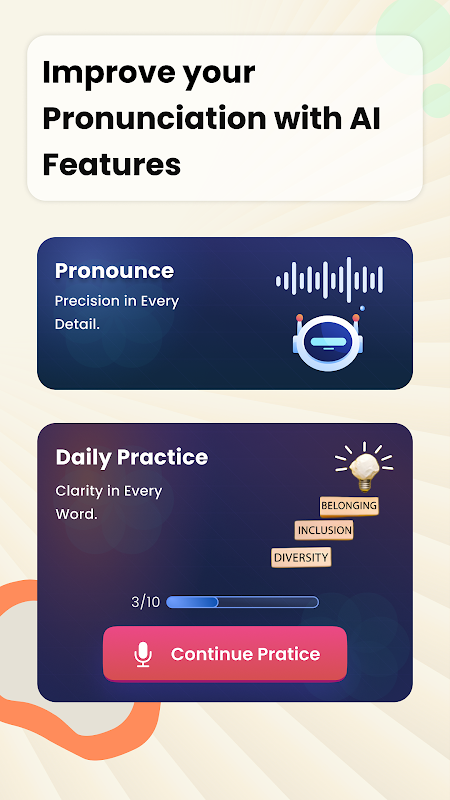 आप इस स्पेलिंग चेकर और वर्ड उच्चारण चेकर को रोजाना एक अभ्यास के रूप में इस्तेमाल कर सकते हैं और यह आपके उच्चारण को प्रभावित करेगा और एक बहुत ही सकारात्मक तरीके से एक वर्तनी परीक्षक के रूप में कार्य करेगा। एप्लिकेशन आपको शब्दों का उच्चारण करने और अंग्रेजी शब्दों, वाक्यांशों, वाक्यों और बहुत कुछ से शब्दों का उच्चारण करने में मदद करेगा।