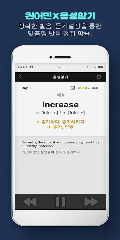 3. आवाज याद रखना: कुल 1150 शब्दों के लिए मूल वक्ता की आवाज के माध्यम से, आप सही उच्चारण सुनने के साथ-साथ बार-बार सुनकर सीख और याद कर सकते हैं। इसके अलावा, श्रवण सेटिंग्स के माध्यम से अनुकूलित श्रवण सीखना संभव है।