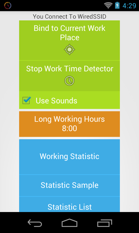 The program is tied to WiFi in your workplace. When you come to the office software records the time of connection to the network as the beginning of the working day. When you leave the office the program logs off from WiFi and believes this time the end of the working day. Is evaluated and the yield on a lunch break. Data is stored in tables and lists. The program also recalls the sound of the end of the day, and shows the time overrun. In the notification bar, you will see the statistics - when you come to work when you can get away with all the breaks as you are at work and how much work remains. Please note that the program is no data on the WiFi did not receive or send any.
