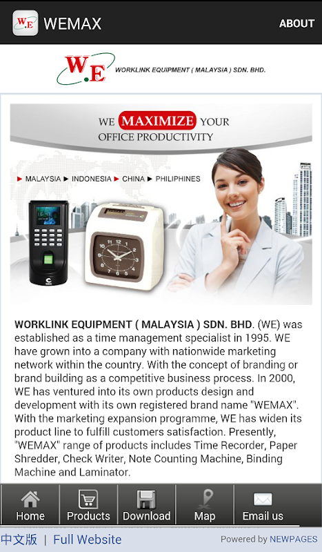 WORKLINK EQUIPMENT ( MALAYSIA ) SDN. BHD. (WE) was established as a time management specialist in 1995, our company is located at Kuala Lumpur, Malaysia. WE have grown into a company with nationwide marketing network within the country. With the concept of branding or brand building as a competitive business process. In 2000, WE has ventured into its own products design and development with its own registered brand name "WEMAX". With the marketing expansion programme, WE has widen its product line to fulfill customers satisfaction. Presently, "WEMAX" range of products includes Time Recorder, Paper Shredder, Check Writer, Note Counting Machine, Binding Machine and Laminator.