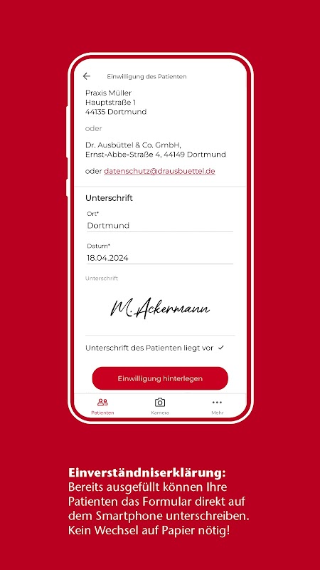 चाहे आप पाठ, चित्र, या दोनों का संयोजन पसंद करते हों, चुनाव आपका है। आप ऐप में कभी भी फ़ोटो ले सकते हैं और जितनी बार चाहें दस्तावेज़ में संपादन और जोड़ सकते हैं। फिर आप अपने पीसी पर वेब एक्सेस का उपयोग करके घाव के दस्तावेज़ों को अपलोड, प्रिंट या अपने प्रैक्टिस सॉफ़्टवेयर पर भेज सकते हैं। घाव का दस्तावेज़ीकरण एक मानकीकृत पीडीएफ़ फ़ाइल के रूप में उपलब्ध है। यह ऐप आपको जर्मन नागरिक संहिता (बीजीबी) की धारा 630f की दस्तावेज़ीकरण आवश्यकताओं का पालन करने में भी मदद करता है।