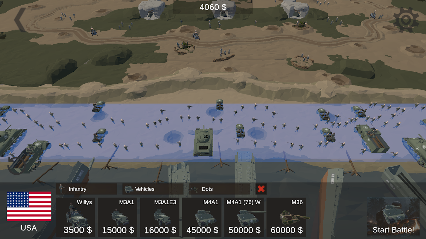 WW2 बैटल सिम्युलेटर के साथ द्वितीय विश्व युद्ध की महायुद्धों में कदम रखें! यूएसए और जर्मनी के रूप में इमर्सिव अभियानों का अनुभव करें, जिनमें से प्रत्येक में तीन अद्वितीय मिशन हैं। भविष्य के अपडेट यूएसएसआर, यूके, जापान और फ्रांस के लिए अभियान और इकाइयाँ लाएंगे। अभियान मिशनों से मानचित्रों पर अपनी खुद की लड़ाइयाँ बनाने के लिए सैंडबॉक्स मोड का उपयोग करें। वर्तमान में 25 अद्वितीय इकाइयाँ उपलब्ध हैं। रणनीति बनाएँ, अपनी इकाइयाँ रखें, और देखें कि वे यथार्थवादी RTS-शैली की लड़ाई में कैसे टकराते हैं। इतिहास को फिर से जीएँ और युद्ध में अपनी सेना को जीत दिलाएँ!