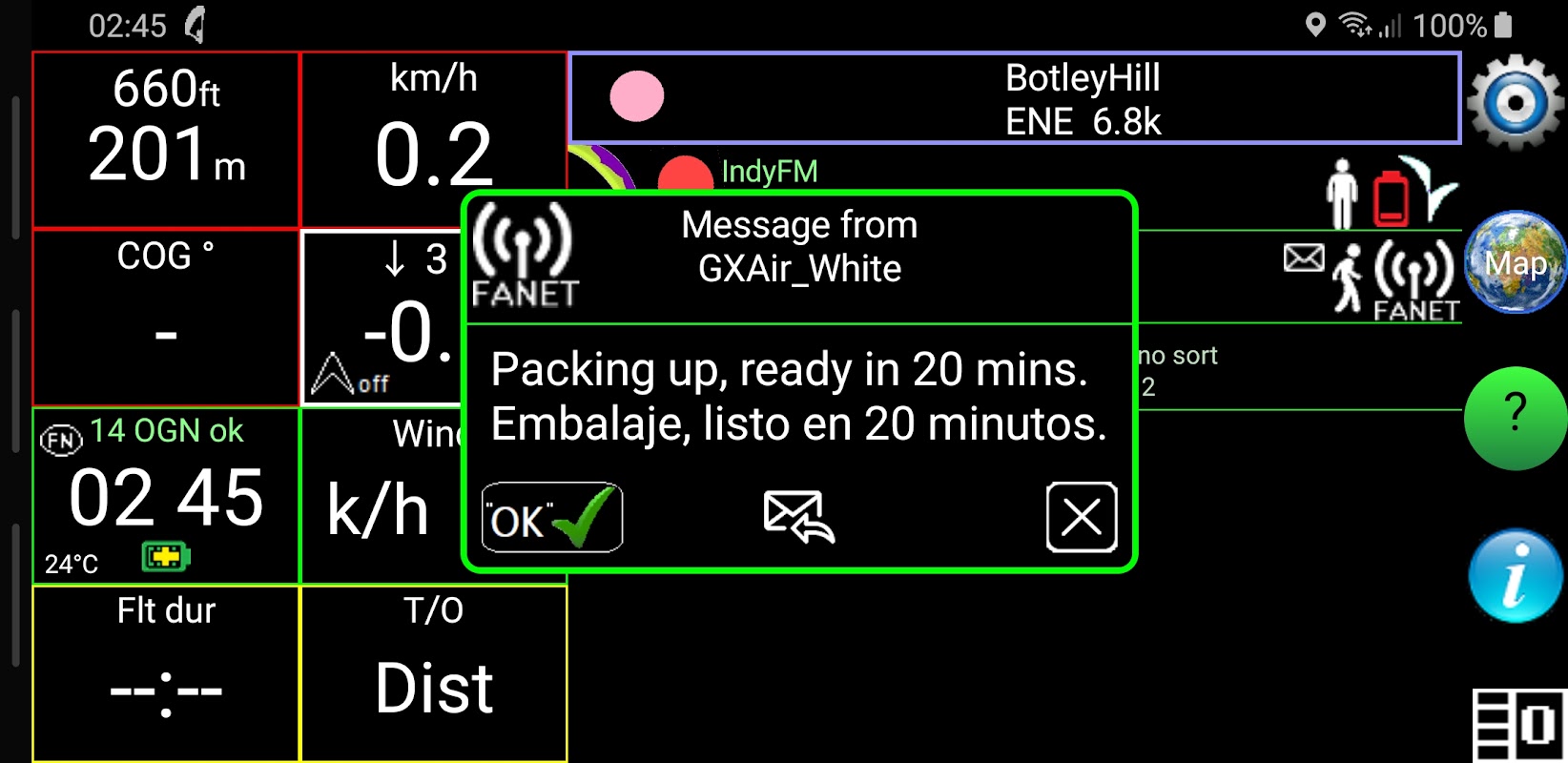 यह AMSL और AGL ऊँचाई, ज़मीनी गति, दिशा, चढ़ाई/डूबने की दर, ग्लाइड कोण, G-बल, हवा की दिशा, उड़ान की अवधि और टेक-ऑफ़ से दूरी दर्शाता है।