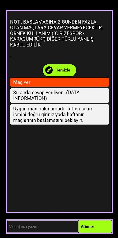 हमारे एप्लिकेशन में कृत्रिम बुद्धिमत्ता तुर्की स्पोर टोटो सुपर लीग टीमों को पहचानती है और केवल स्पोर टोटो सुपर लीग मैचों पर प्रतिक्रिया देती है। कृत्रिम बुद्धिमत्ता के लिए मैच ढूंढने और कृत्रिम बुद्धिमत्ता के लिए भविष्यवाणियां करने के लिए, मैच दिन के दौरान होने चाहिए। मान लीजिए, यदि किसी टीम का दिन के दौरान मैच है, तो आप उस टीम के लिए भविष्यवाणी का अनुरोध कर सकते हैं। अन्यथा वह उत्तर नहीं दे सकता। हमारे कृत्रिम बुद्धिमत्ता स्पोर्ट्स टोटो सुपर लीग मैच भविष्यवाणी एप्लिकेशन का इंटरफ़ेस सरल है और इसका उपयोग करना बहुत आसान है।