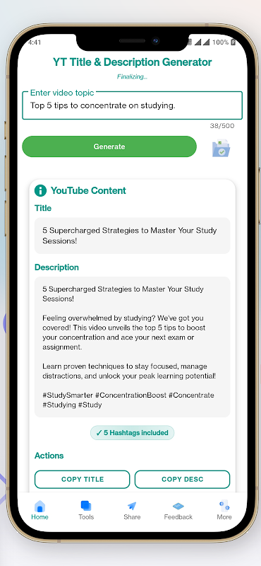 अपने शीर्षकों और विवरणों को एक टैप से कॉपी करें या सीधे अन्य ऐप्स पर साझा करें।