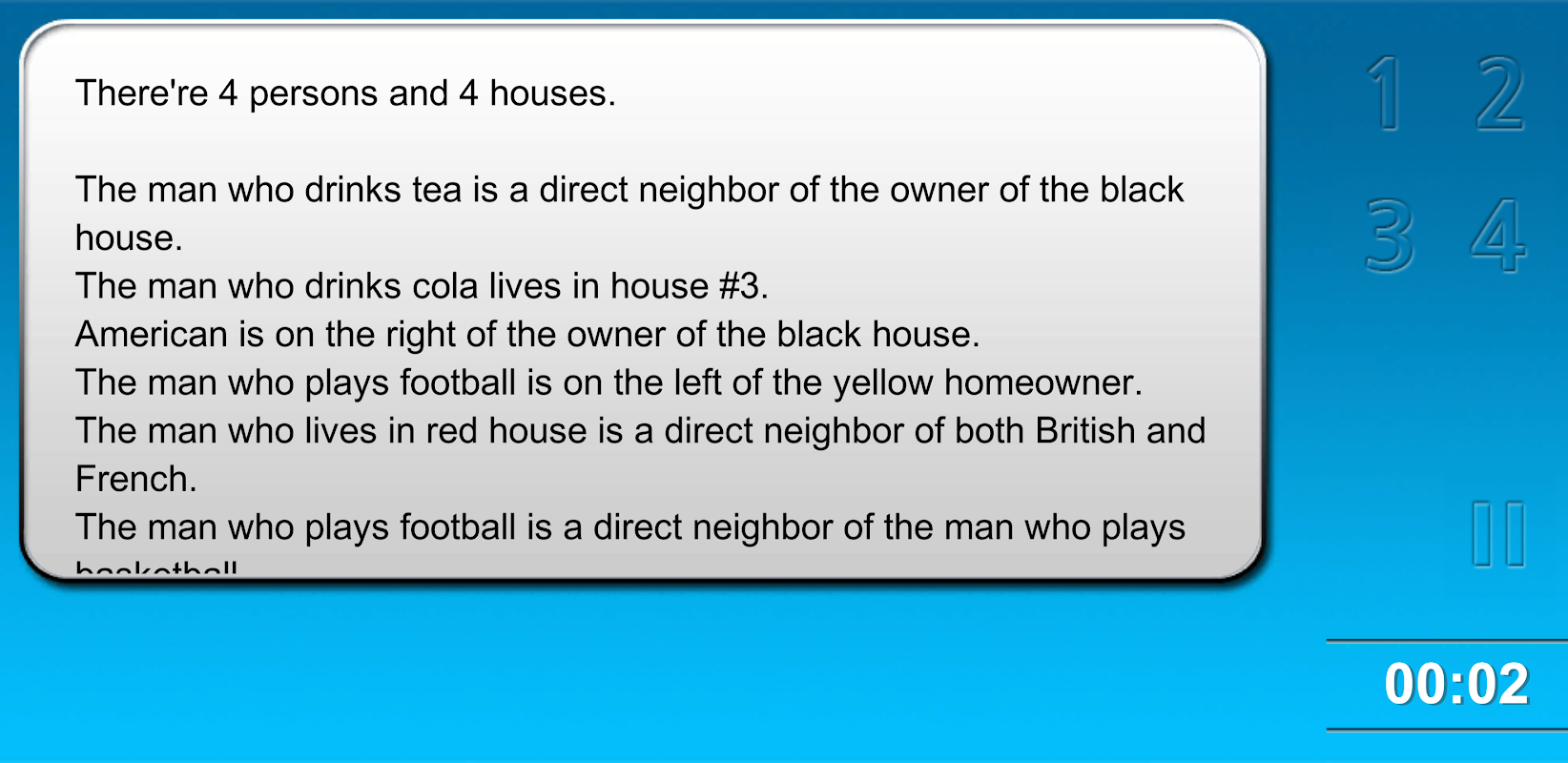 यह दावा किया जाता है कि आइंस्टीन ने अपने बचपन में इस पहेली का आविष्कार किया था और 98% आबादी इसे हल नहीं कर सकती है, हालांकि इस दावे के लिए कोई सबूत नहीं है।