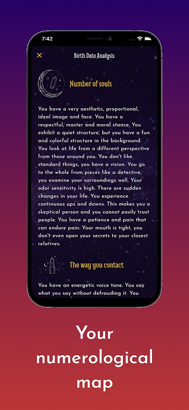 जेनिथ न्यूमेरोलॉजी एप्लिकेशन उपयोगकर्ताओं को जन्म तिथि और नाम-उपनाम जैसी जानकारी का उपयोग करके अपने व्यक्तिगत संख्यात्मक मानचित्र बनाने की अनुमति देता है। हमारे उपयोगकर्ता अपने संख्यात्मक मानचित्रों की जांच करके अपने बारे में अधिक जान सकते हैं। साथ ही, यह ऐप उन्हें अपने व्यक्तिगत संख्यात्मक चार्ट को अपने दोस्तों और परिवार के साथ भी साझा करने की अनुमति देता है।