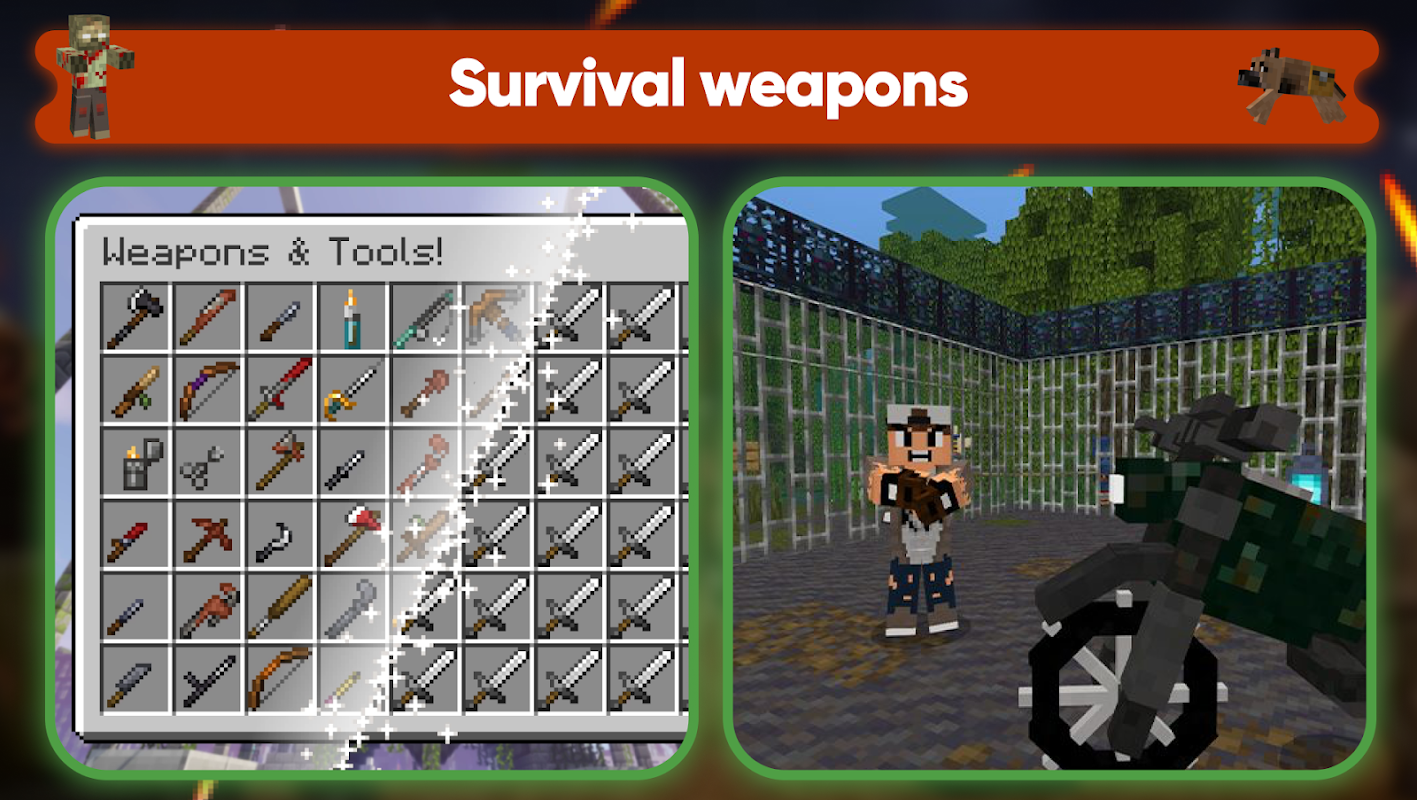 ✔️ विभिन्न सुरक्षात्मक इमारतों 🏢, शिल्प औषधि 💦 और बेडरॉक हथियार का निर्माण करें - यह सब और न केवल माइनक्राफ्ट सर्वाइवल मोड हमें पहुंच प्रदान करेगा, क्योंकि ऐप जीवन के लिए लड़ाई की तरह नहीं दिखेगा, बल्कि मनहूस को हरा देगा। .