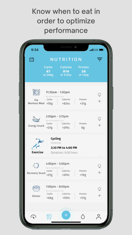 आज और / या भविष्य की तारीखों के लिए, अपने वर्कआउट्स को जोन में जोड़ें। एक बार जब एक कसरत जोड़ दी जाती है, तो आपकी दैनिक भोजन योजना जो हम प्रदान करते हैं, वह व्यायाम के समय और विशिष्ट मांगों के लिए स्वचालित रूप से समायोजित हो जाएगी। हम आपको बताएंगे कि आपको अपने वर्कआउट के लिए अपने शरीर से सबसे अधिक भोजन प्राप्त करने के लिए अपने भोजन (और अपनी ऊर्जा स्नैक) को कब खाना चाहिए।