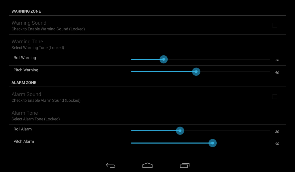 Inclinometer is a lateral and longitudinal inclination (roll and pitch) indicator as well as a compass (full version only). It is very accurate and allows roll and pitch calibration as well as defining audible warning and alarm levels independently for roll and pitch.