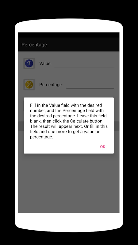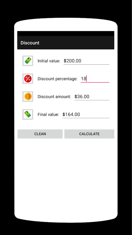 Simple and intuitive app to help you calculate percentage, profit margin, commission on sales and products, average and discounts. In addition to doing the calculations in the conventional way, by entering a value and getting a result, you can get that value from the result itself. For example, in addition to being able to obtain the actual value of the profit by entering the cost value and the margin percentage, you can say for example the desired profit value and the amount you intend to sell, when calculating you will be informed of the maximum value of the cost price of the product. All on the same screen, simply and with the help of buttons with information on how to fill in the fields to find the result you are looking for.