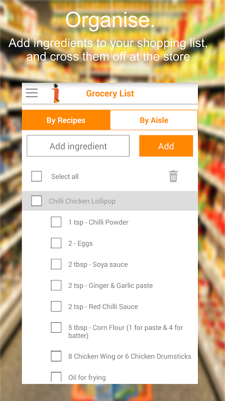 - My Grocery: Add recipes or ingredients to your shopping list, and cross them off at the store.