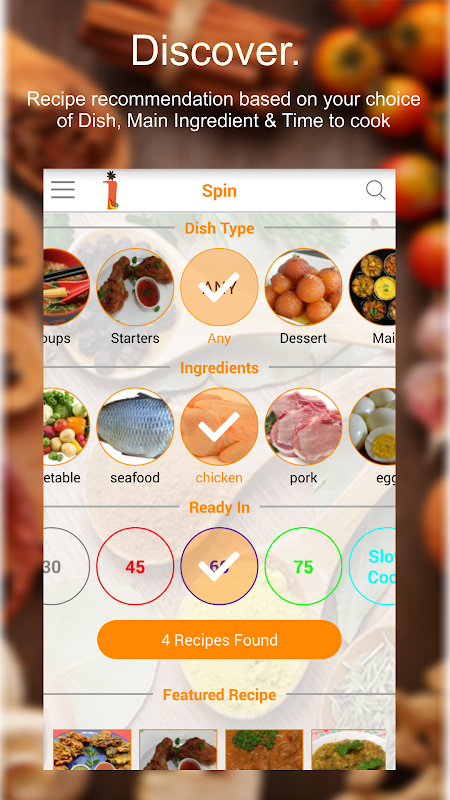 - Spin Search: Get recipe recommendation based on your choice of Dish type, Ingredient and time to cook.