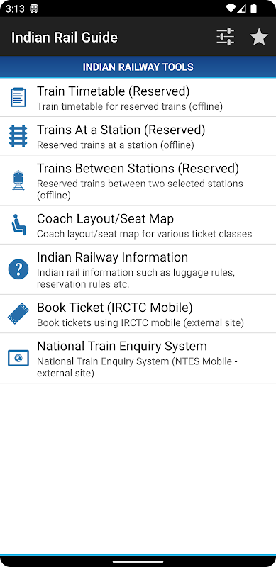 Indian Rail Guide is a travel companion app for the frequent travellers of Indian Railways. With Indian Railway Guide, you can access train timetable, trains available at a station, trains between stations and much more from your mobile. Indian Railway Guide app has the following train enquiry features,