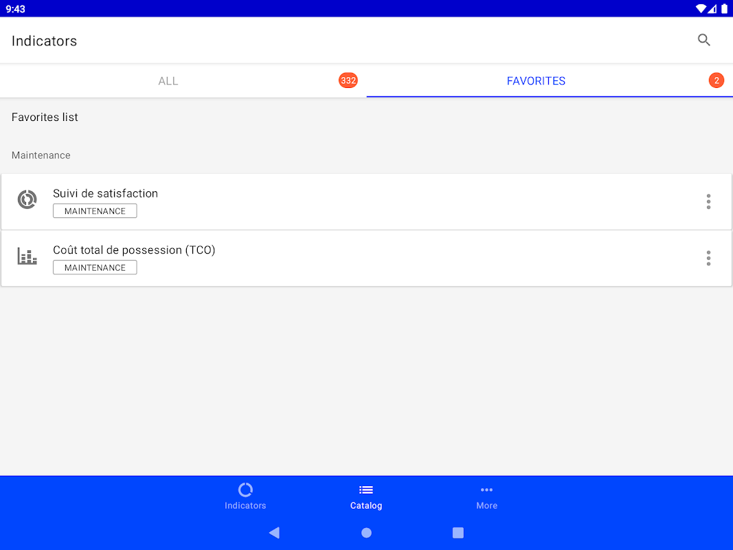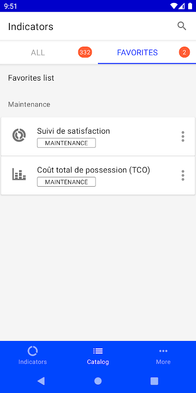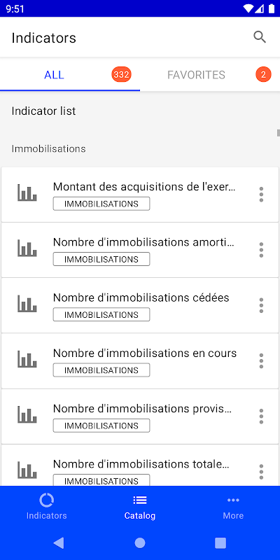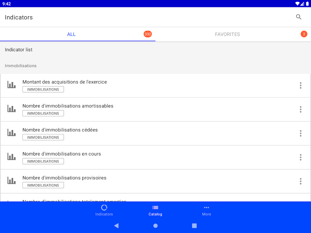 This mobile application can be used to find and display the indicators of the Cegid XRP Ultimate product. Favorites are chosen to see the most relevant indicators as soon as the application is opened.