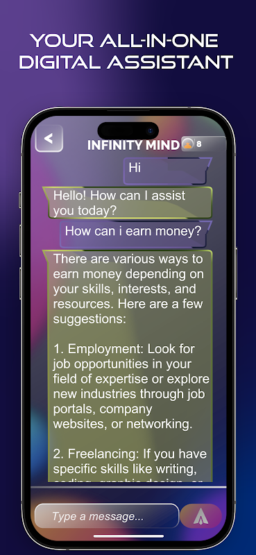 With Infinity Mind - AI Assistant, you have an all-around digital guru at your fingertips. It caters to your academic, professional, creative, and even personal needs. Fast, accurate, and efficient, it's indeed a valuable addition to your mobile apps collection. Experience the future of AI with Infinity Mind.