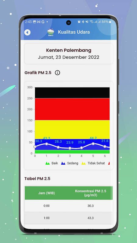 Presents air quality information in terms of Particulate Matter (PM2.5) concentrations in several cities in Indonesia
