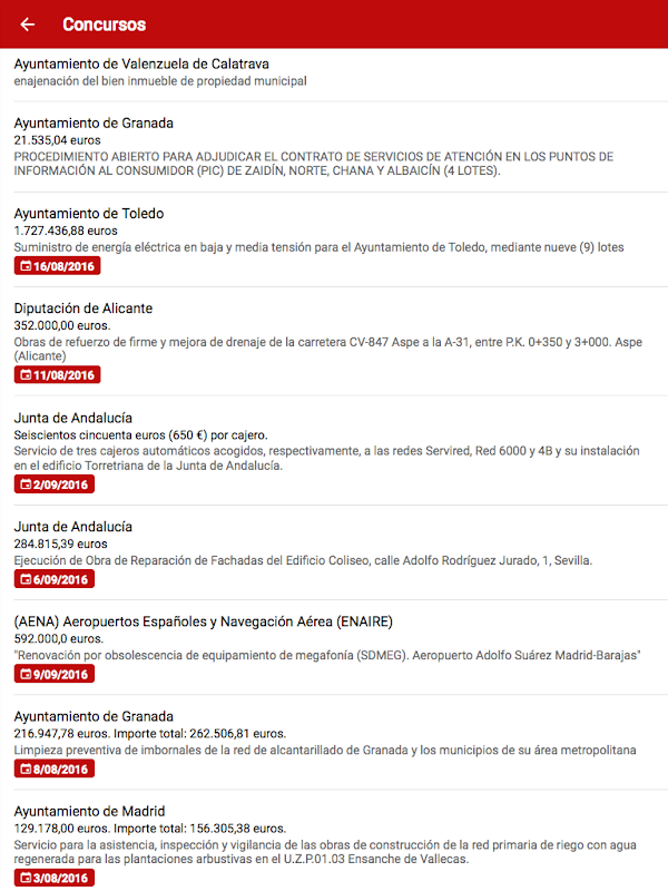 Consulta cada día aquellos concursos y licitaciones de interés que se publican en España. Utiliza el buscador abierto con el fin de conocer todas las posibilidades o regístrate en la plataforma de manera totalmente gratuita para disfrutar del periodo de 20 días de prueba. Configura tu cuenta en función de numerosos criterios de segmentación y recibe diariamente en tu móvil alertas sobre los anuncios que te interesan. De cada concurso puedes ver el expediente completo (anuncios previos, convocatorias, modificaciones, etc.), acceder a la fuente original de la información y realizar seguimientos continuos para permanecer atento a los cambios. Genera a su vez los informes sobre concursos, organismos adjudicadores y adjudicatarios que necesites.