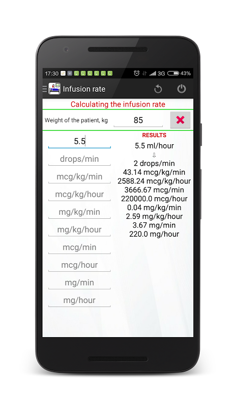 The program allows to calculate the infusion rate of drugs. You'll need to select the patient's weight, dilution of the solution. Transfer from ml/hr to mg/min, mg/kg(lb)/min, mg/kg(lb)/hour, mg/hour, mcg/min, mcg/kg(lb)/min, mcg/kg(lb)/hour, mcg/hour is fast, simple and to the minimum number of clicks. In the settings you can choose kilograms or lbs.