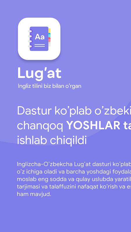 Inglizcha-O'zbekcha Lug'at dasturi barcha yoshdagi ingliz tilini o'rganuvchilar uchun ideal dastur. Dastur ko'plab so'rovnomalar va izlanishlarga asoslangan holda eng qulay va osson dizayn bilan yaratilgan. Dastur ko'plab murakkab so'zlar va ularning to'liq va mukammal tarjimasini o'z ichiga oladi.