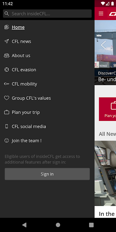 Thanks to insideCFL you will always have the latest CFL information wherever you are. Want to stay up-to-date concerning the news of our company? If so, there is only one click/download left to do! In addition to current information from our various activities, whether in the field of public transport or freight and logistics, insideCFL provides you with information regarding the diversified services of our company, for instance the carsharing offer of our subsidiary CFL mobility, or the dream trips offered by CFL évasion. For those looking to join our group as a future employee in one of our challenging work environments, the app provides an overview of all current job opportunities to seize. Our CFL colleagues take advantage of additional exclusive features in the staff part of the app.