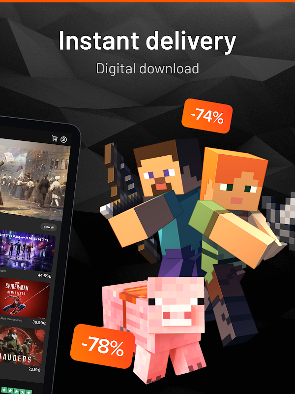 Download the app to get started. You can access the Instant Gaming app for various discounts on games. Log in and register with your credentials for the mobile application and browse through thousands of search results. Find your selected game and explore the prices. Get notified instantly when your preorders are delivered or when your game is back in stock. Monitor the best deals, instant offers, and prices every time. Once you've downloaded the app, access over 6000+ games on the go! (Steam, Origin, Battle.net, Ubisoft Connect…).