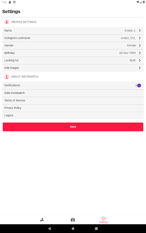 Instant Match is a simple person matching application. We search the person you looking for from your information and getting person information to you. If you like the person you're going to request the social media username of the person. If they accept you, you'll have their social media profile.