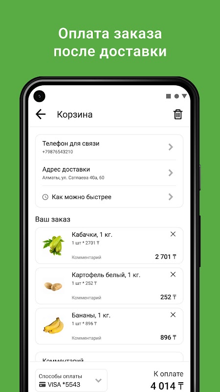 We will deliver orders over 5000 ₸, there is FREE delivery. Products and goods from METRO Cash & Carry, Galmart, A-Store, Carefood, Green Bazaar, INTERFOOD, APTEKAPLUS and many other favorite stores with delivery to your home or office in 2 hours or at the specified time.