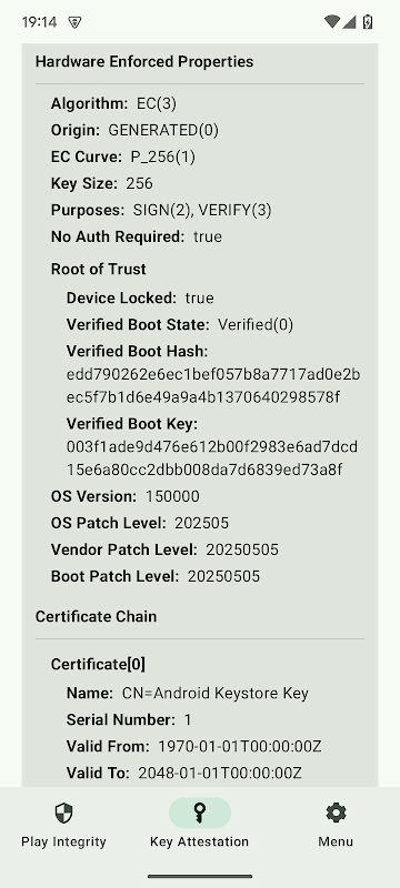 * **Keystore Attestation Check:** It displays detailed results on how the **cryptographic keys generated by your Android device** are evaluated. This covers security hardware evaluation and certificate chain verification results.