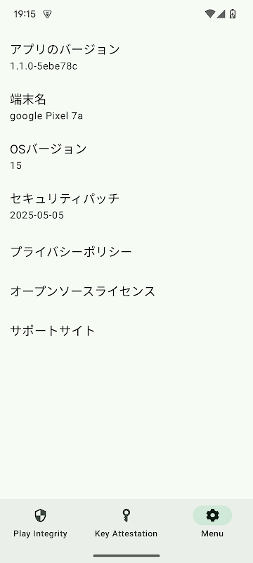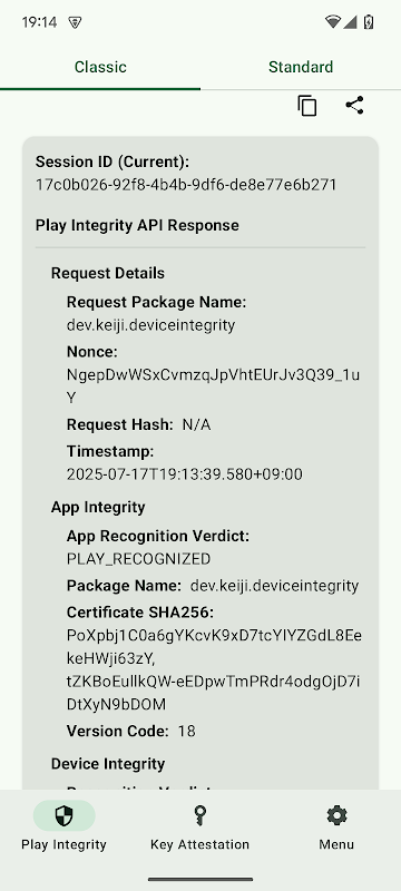 * **Device Integrity Verification Check:** This shows detailed results on how your Android device is evaluated by Google's Play Integrity API and attestation verification mechanisms. This includes device integrity and app licensing status.