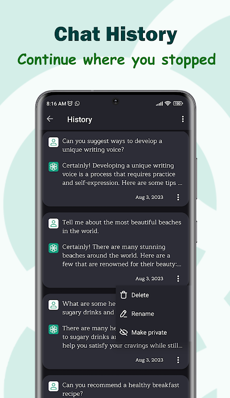 Private History: Protect your sensitive conversations using device credentials such as fingerprints, PINs, or patterns, ensuring that your conversations remain confidential and safe.