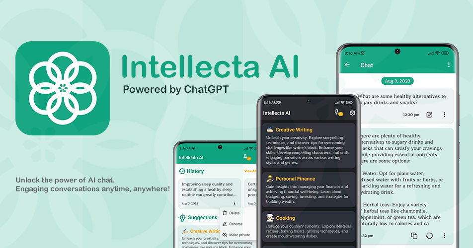 Meet Intellecta AI, your personal intelligent chat assistant powered by ChatGPT & GPT-3.5 Turbo. Engage in natural and interactive conversations. Whether you need a friendly companion or a source of useful information, Intellecta AI is here to make your chats more engaging and enjoyable.