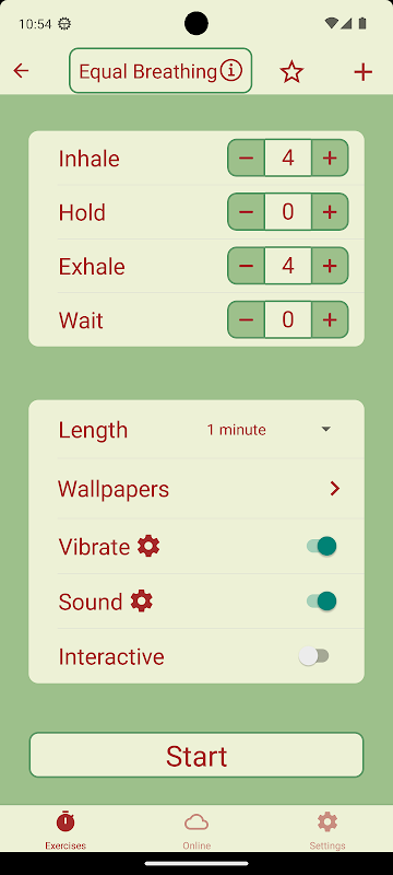 Each exercise can be fully customized with respect to the duration of each step (inhale, hold, exhale, wait). The speed can also be set to fit your breathing style and lung capacity.