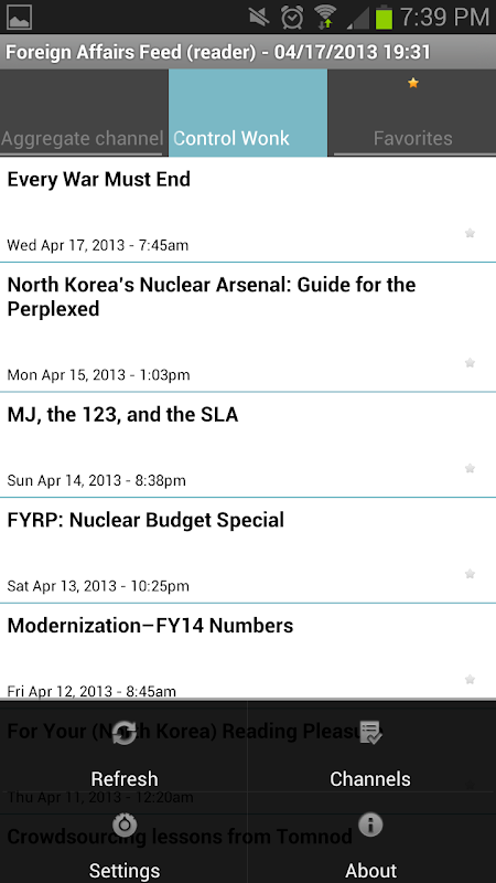 This app allows you to follow prominent voices in foreign affairs as well as related news and current affairs categories via RSS, while adding your own as well. Enable/Disable feeds from the Aggregate Tab by long-pressing a feed from the Channels option. It is based on the open source app, FeedGoal. Several new feeds have been added; if you installed the app a while ago, clear the cache or uninstall and reinstall for these new feeds to work. Last updated 7/15/2014