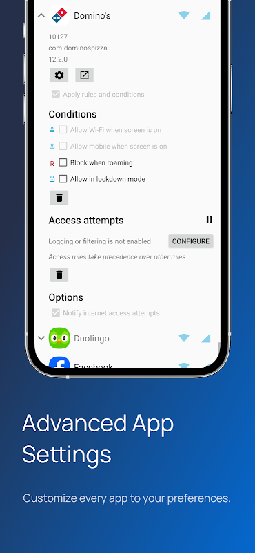 - **Customizable Access Control:** Allow or block individual internet addresses per application, giving you unparalleled control over your device's connectivity.